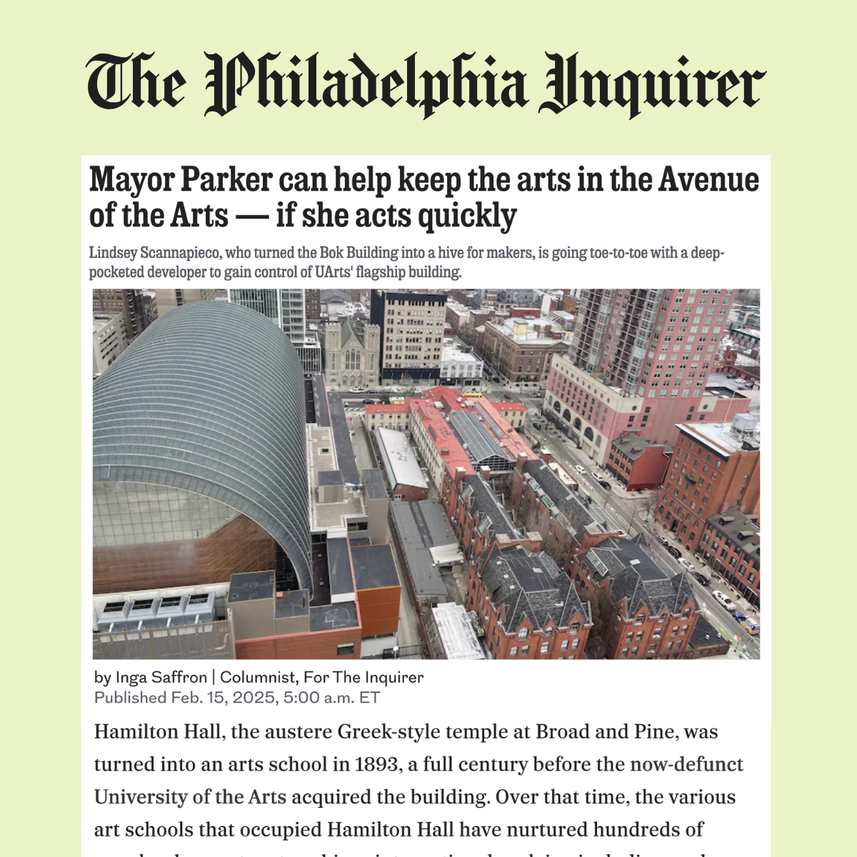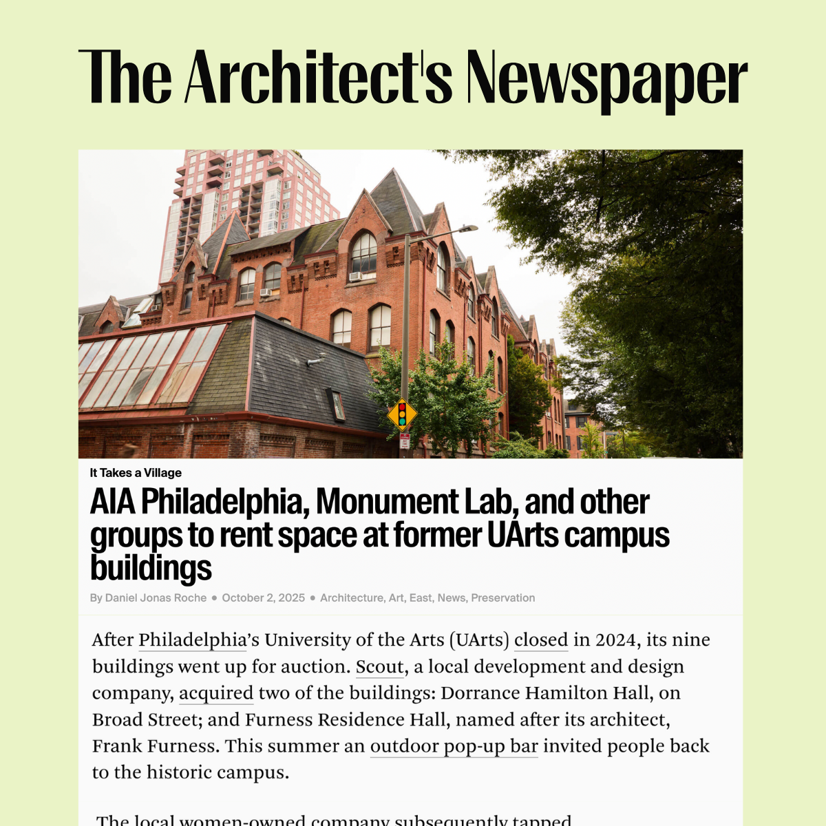 On March 17, 2025 the former UArts site is acquired by Scout, the organization behind the transformation of the Bok Building in South Philadelphia. Similar to their work at Bok, the goal is to keep the space accessible to working artists, makers, and small businesses, and provide affordable housing for artists in Furness Hall.