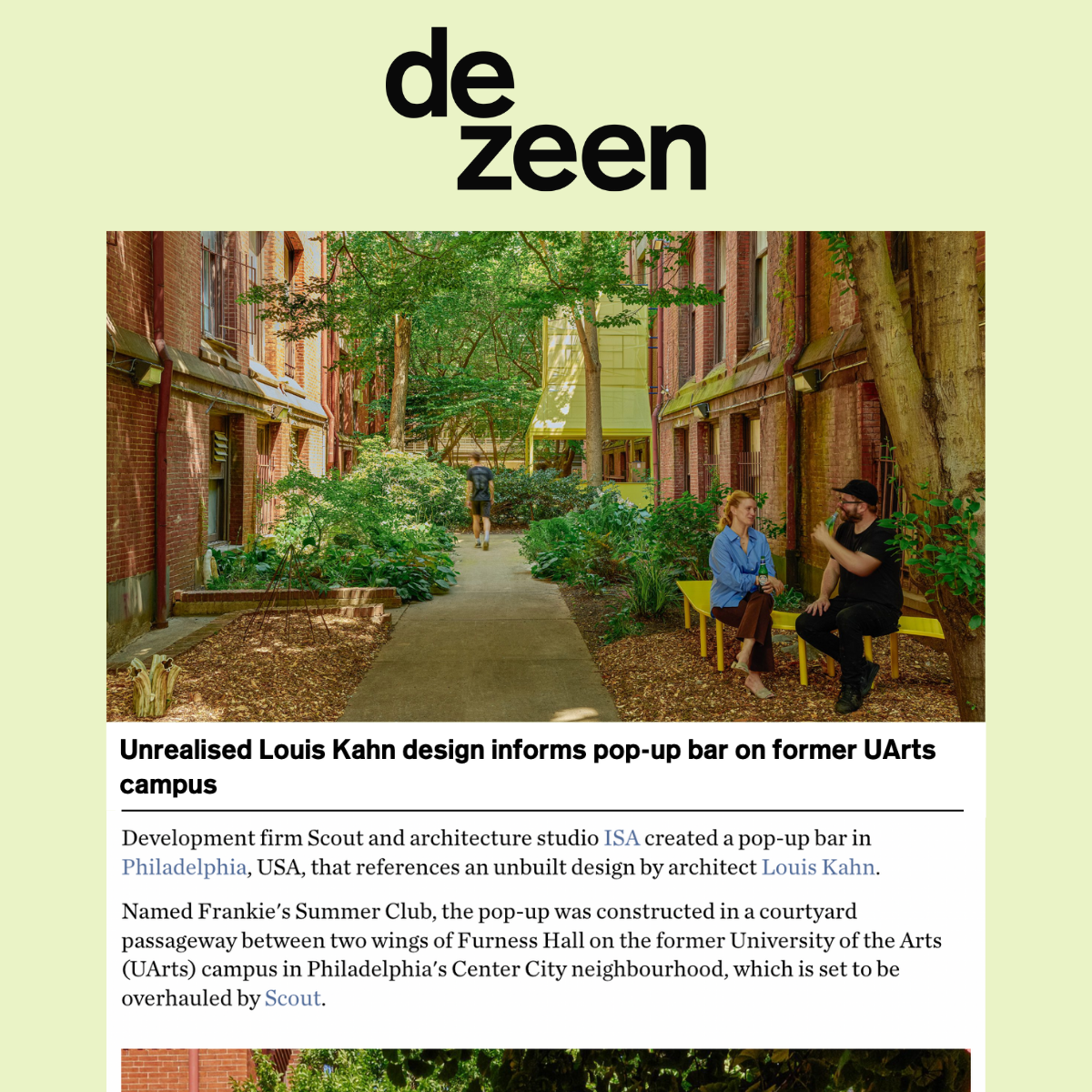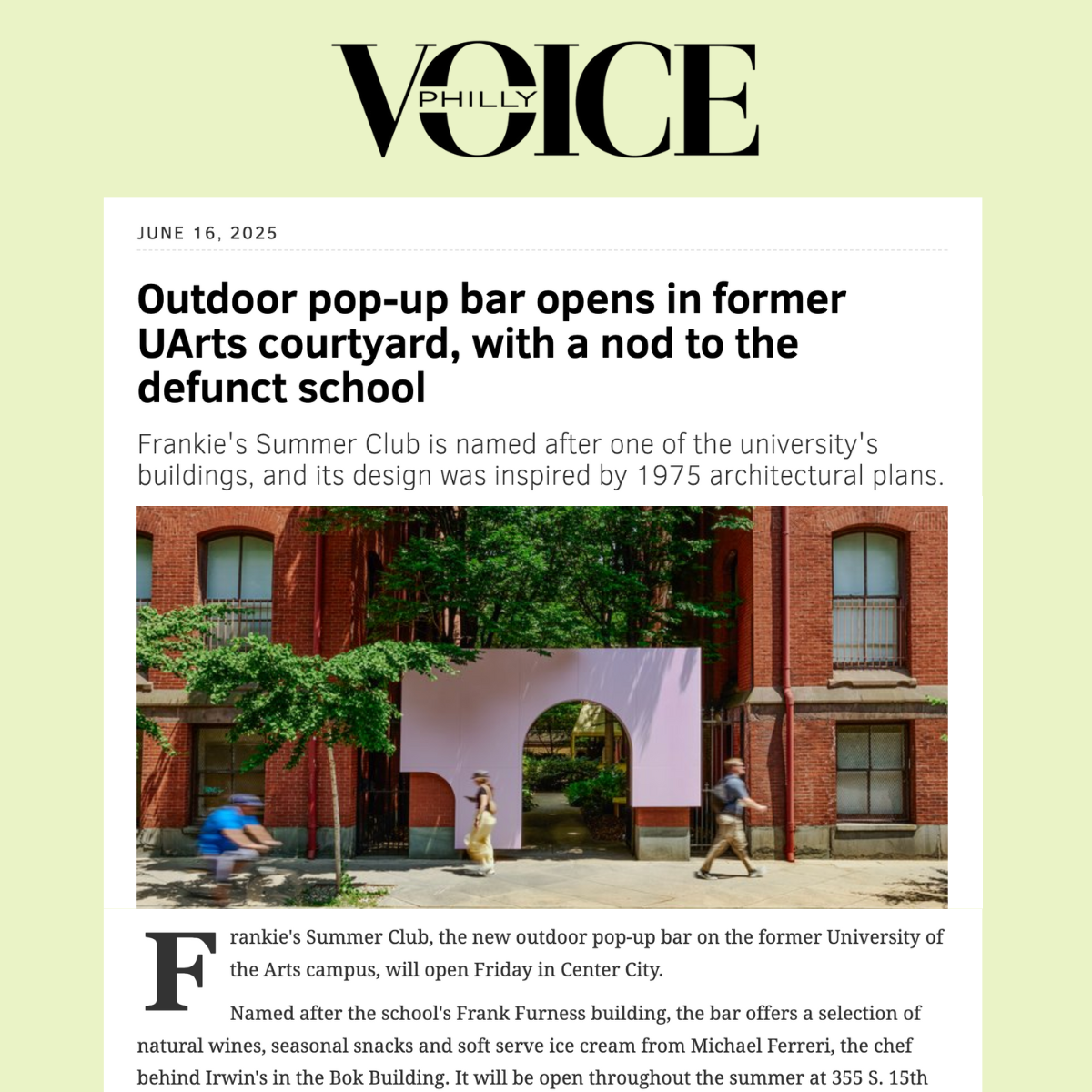 From June 4-8, 2025, Scout hosts a five-day “Celebration of Life” in the building’s atrium to honor the legacy of UArts. Later that same summer they open Frankie’s Summer Club (a nod to architect Frank Furness) as a temporary pop-up in the courtyard, welcoming the community back into the space.