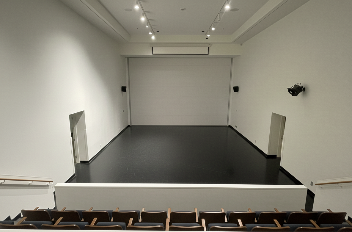 A purpose-built space designed for focused presentations, immersive screenings, and group discussions with tall ceilings, tiered balcony seating, and a large projection screen with full film projection capabilities. The lower level is flexible, accommodating additional seating, lectures, presentations, or cocktail-style setups. Its adjacency to the Great Hall allows for abundant natural light when the screen is raised and seamless flow between event spaces, making it ideal for teams, educators, creatives, and any gathering that requires a comfortable, ready-to-go viewing environment.
