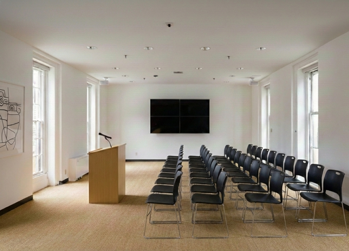A private event space just off the main lobby, located in the northeast corner of the building and overlooking Broad and Delancey Streets. The focused layout is ideal for lectures, panels, presentations, creative programs, and gatherings centered on conversation and exchange. The space features self-service AV, adaptable seating, and an adjacent private room for green room or breakout use.